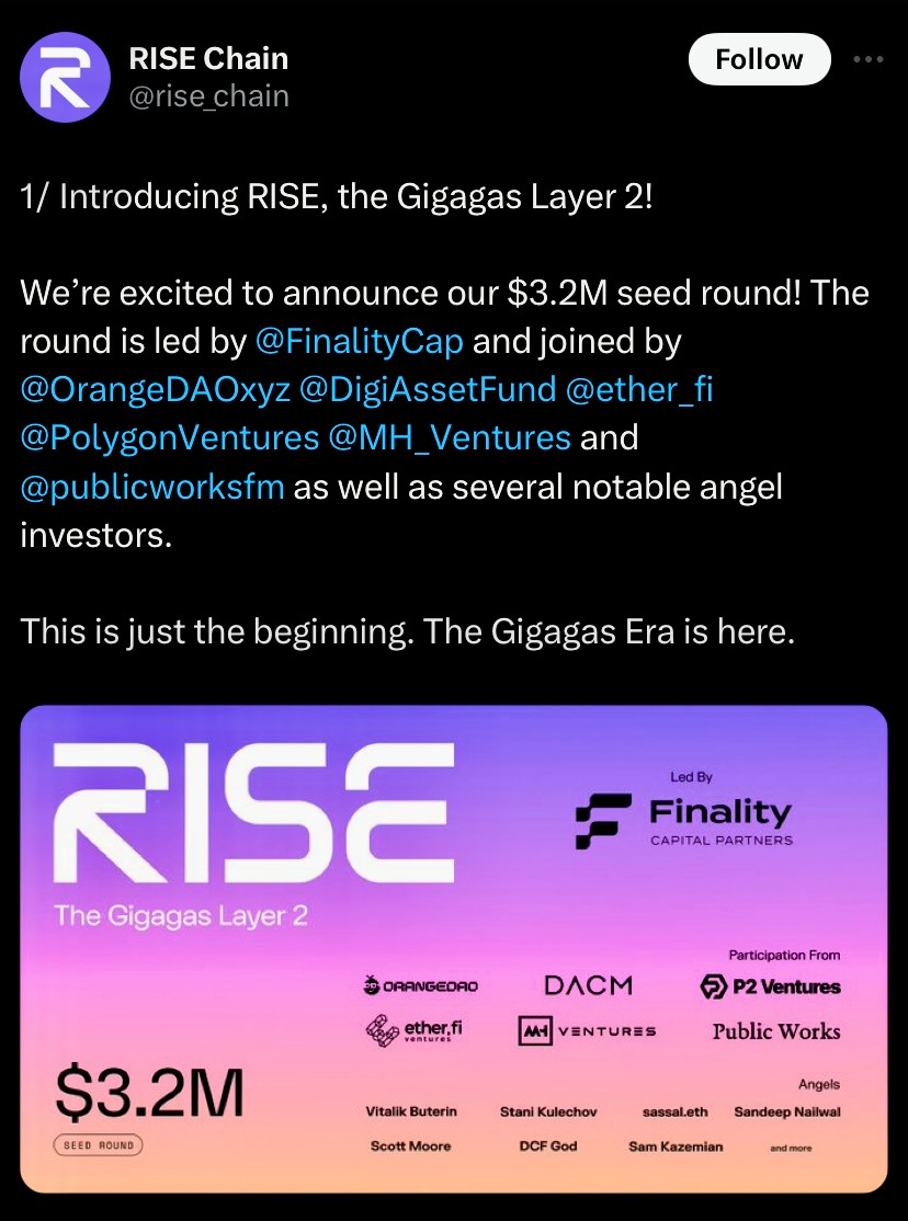 Rise chain announce $3.2M seed round led by Finality cap with other investors like Vitalik, Sandeep etc
