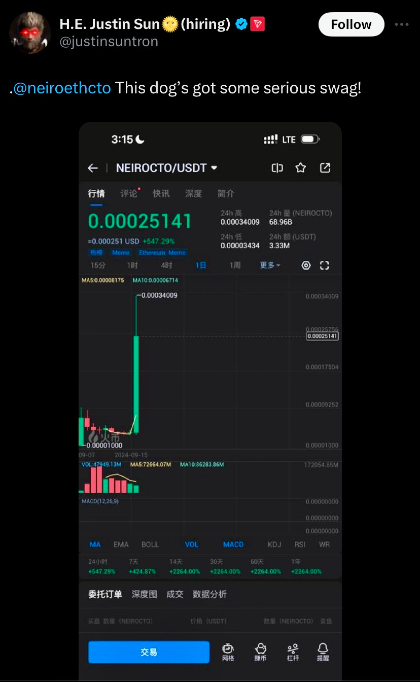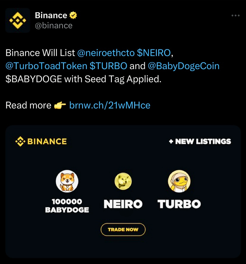 Binance lists two Neiro. The cabal one was listed on futures and the other a CTO invested by Justin Sun was listed on spot. The CTO did 10x in few mins after Binance announcement and the other dumped by some margins