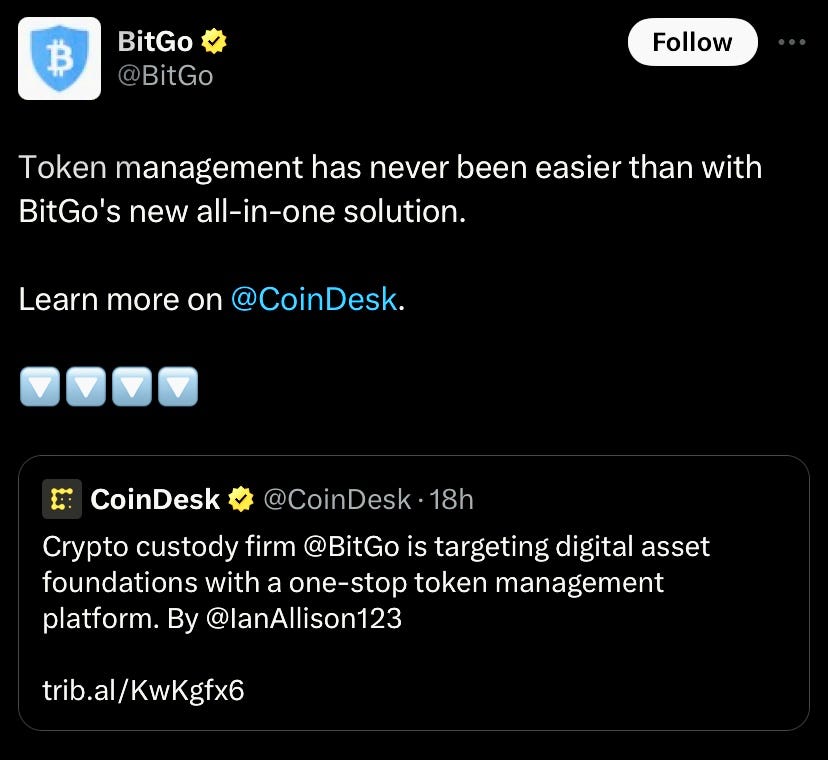 Bitgo unveils new Token management product for crypto foundation. Worldcoin, LayerZero, SUI and ZetaChain are among their first customers