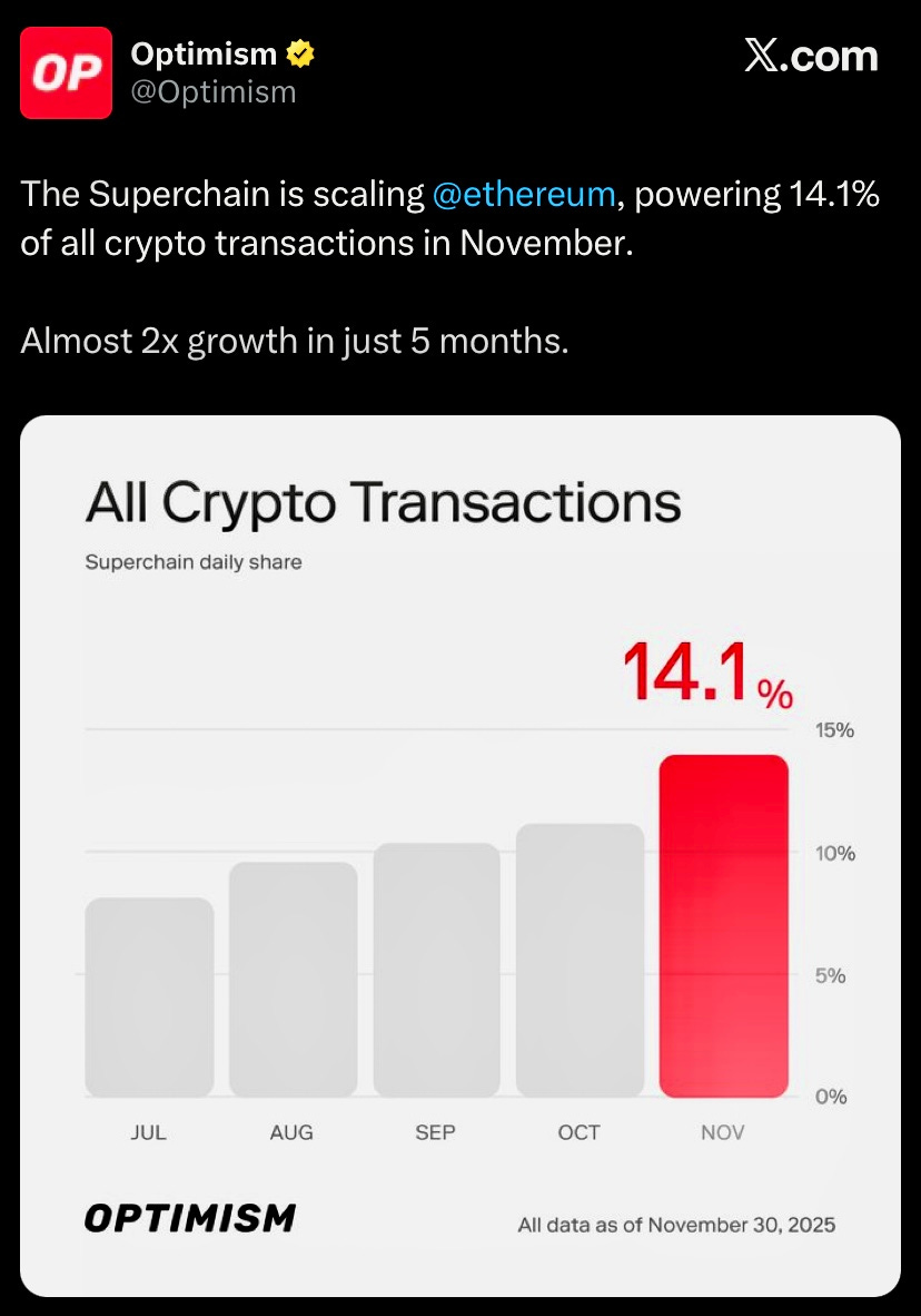 Optimism reported that the Superchain (chains built using OP stack) powered 14.1% of all crypto transactions in November.
