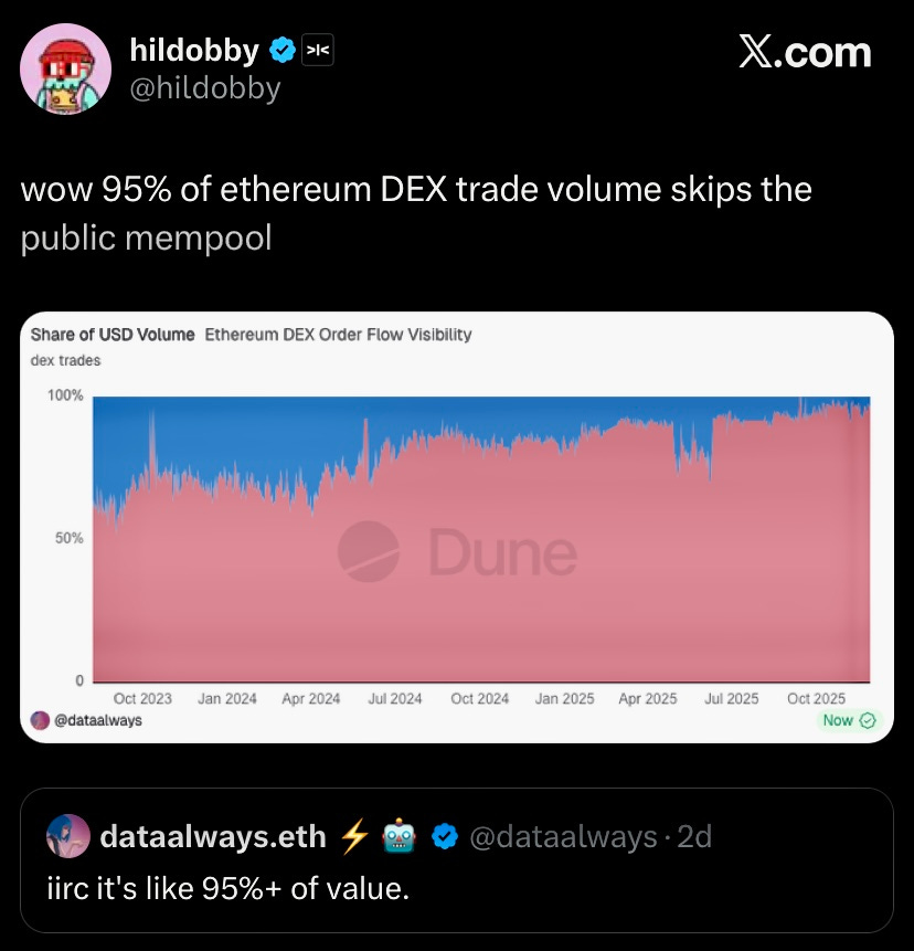 Dragonfly head of data, Hildobby noted 95% of Ethereum dex trade skip the public mempool
