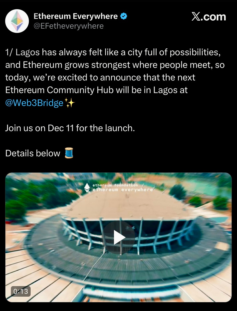 Ethereum foundation team, Ethereum Everywhere, dedicated to connecting communities globally, launched Ethereum Community Hub in Lagos, Nigeria and will host an event on December 11, 2025