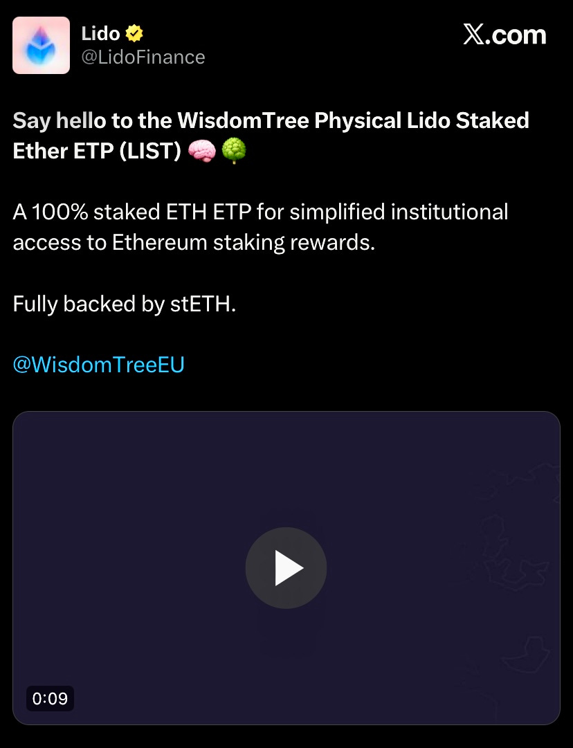 WisdomTree launched WisdomTree Physical Lido Staked ETH ETP (LIST), Europe’s first ETP exclusively holding Lido’s stETH, providing institutional investors regulated access to staked ETH yields with ~$50M initial AUM