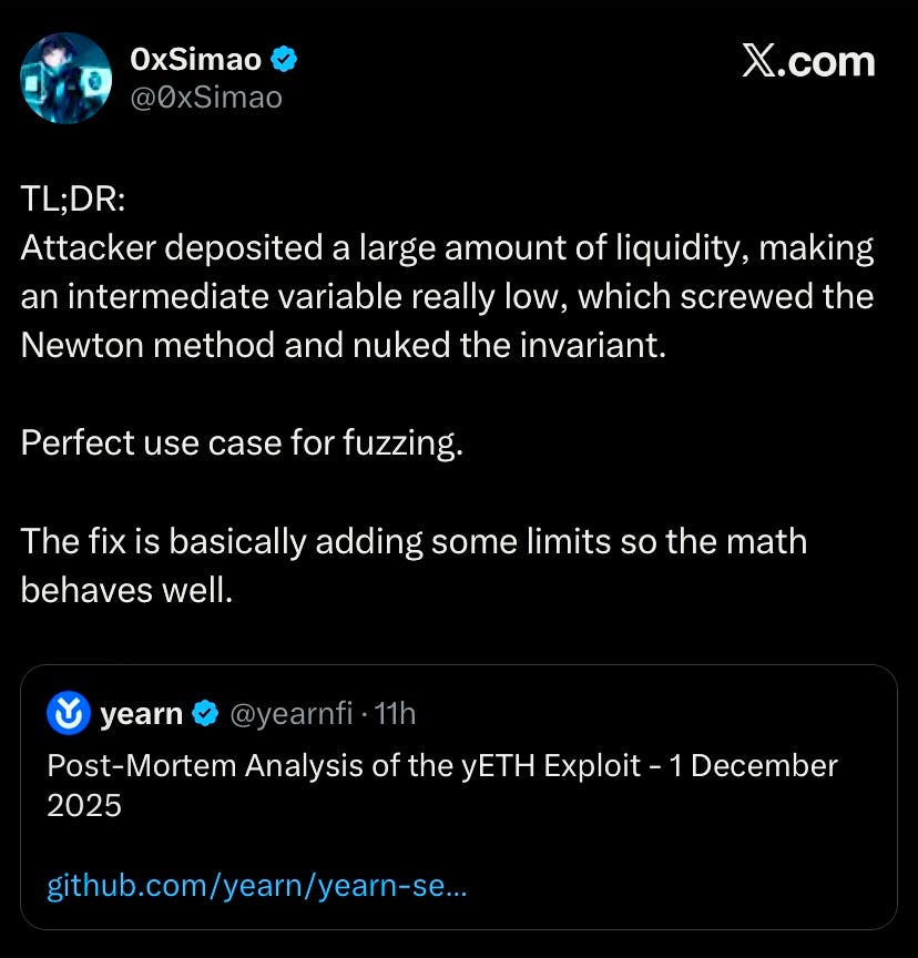 Yearn released hack Post-Mortem, the attacker deposited huge liquidity, causing an intermediate variable extremely low, causing the Newton solver to misfire and break the invariant. The fix is adding limits