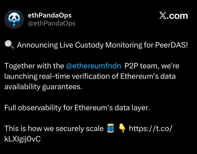 Ethereum DevOps team, ethPandaOps released live custody-monitoring tool, built on their dasmon engine, to track PeerDAS data sampling introduced in Fusaka