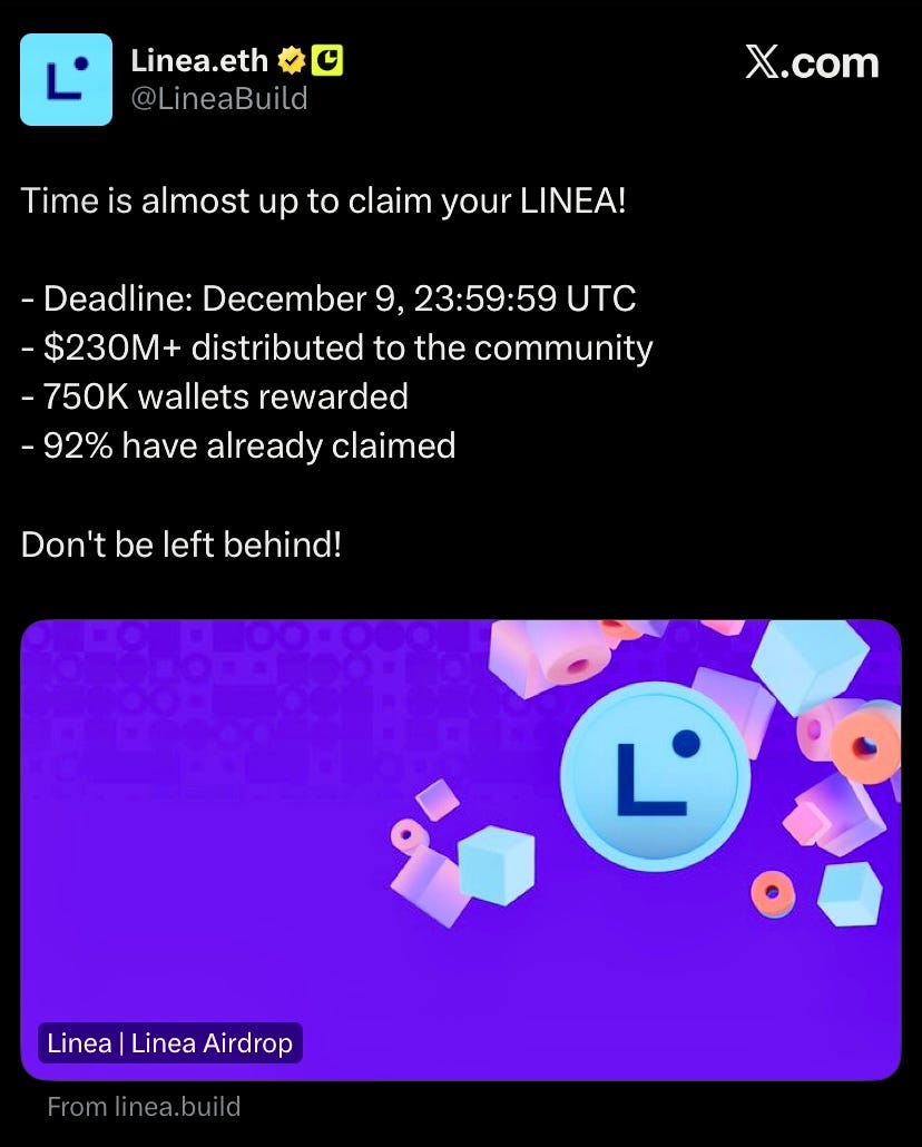 Linea set deadline to claim airdrop for Dec 9, 2025 at 23:59:59 UTC