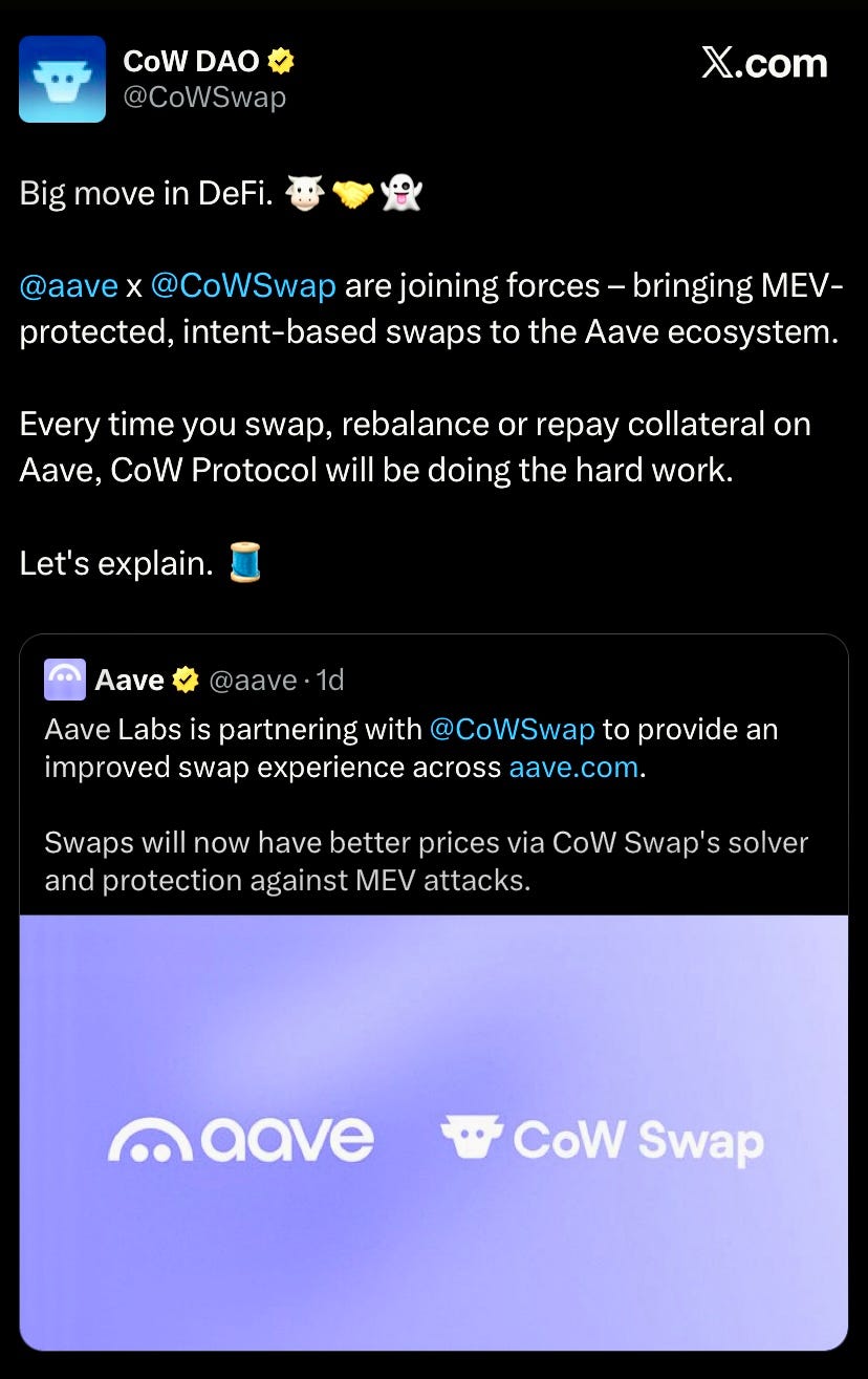 Four days ago, Cow DAO introduced a proposal seeking $34M to cover legal expenses. Meanwhile, Aave Labs announced it will integrate CoW Protocol’s MEV-protected solver network into all Aave[.]com swaps and debut the first intent-based flash-loan product
