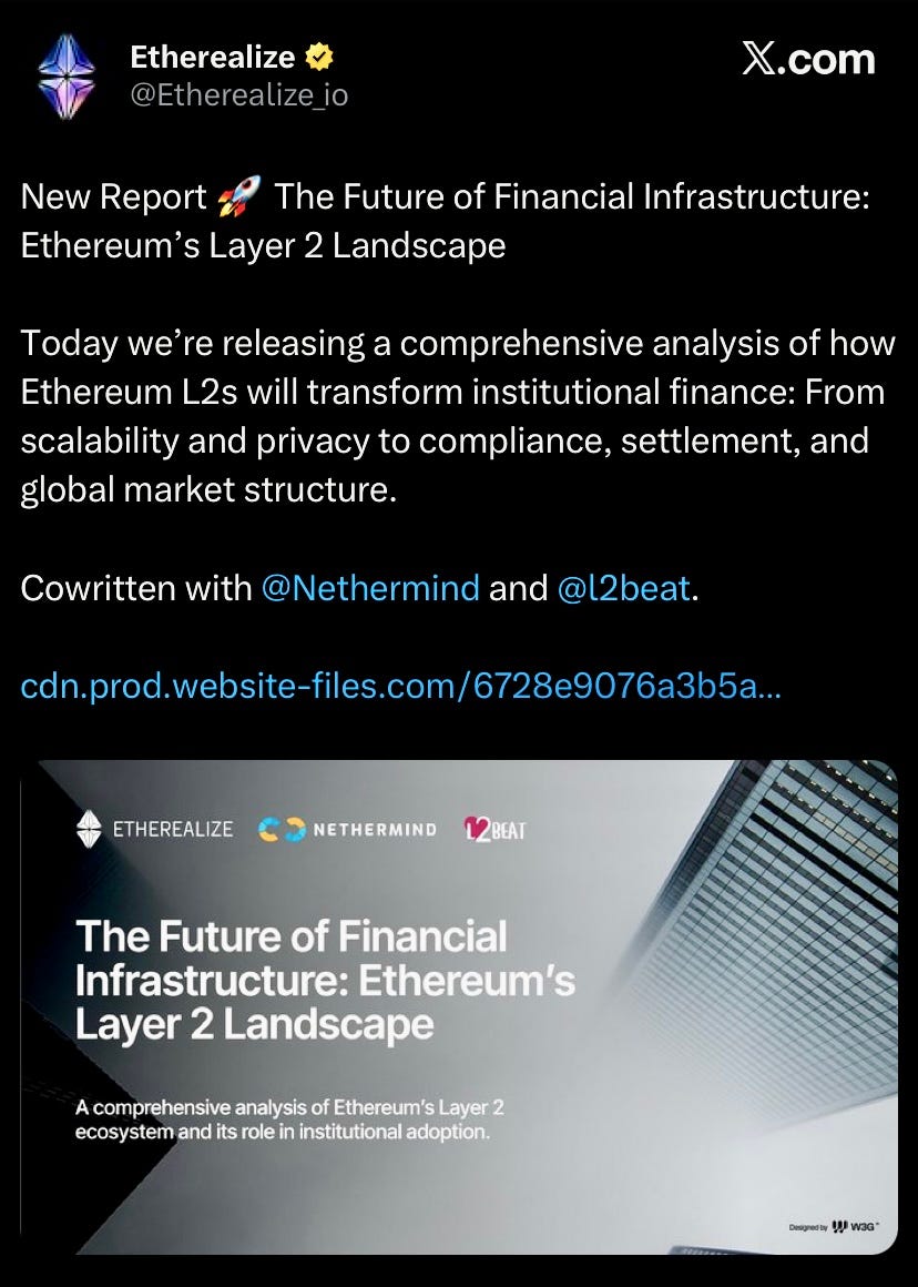 Etherealize, Nethermind, and L2Beat released a joint report on Ethereum’s L2 ecosystem, highlighting its role in enabling institutional adoption of on-chain financial infrastructure.
