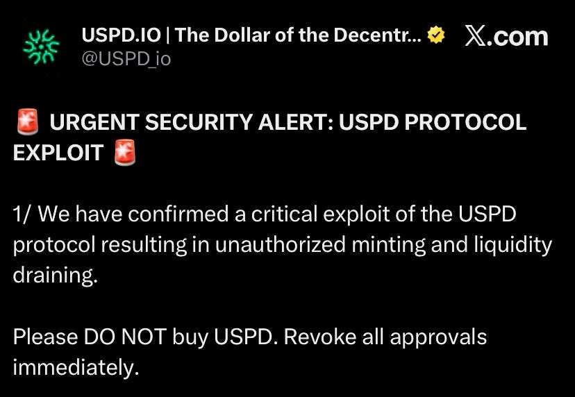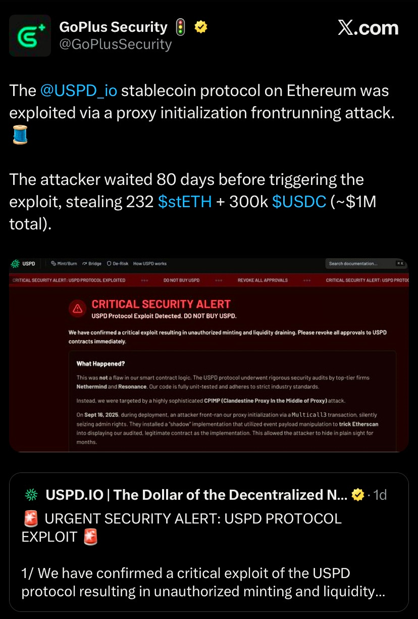 USPD, a permissionless stablecoin protocol, disclosed that it was hit by an exploit. The attacker used CPIMP (proxy intermediate hidden proxy) attack technique to seize the proxy contract admin rights during the deployment phase, disguised and waited for 80 days before executing the attack, hacking 232 stETH and 300k USDC