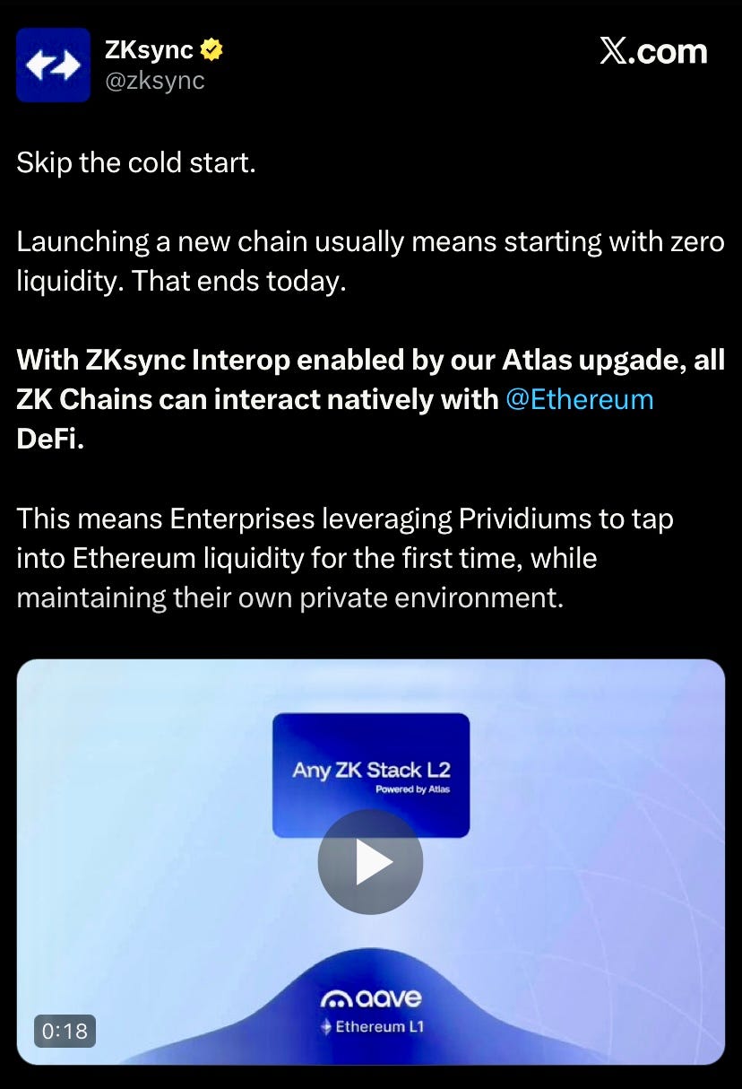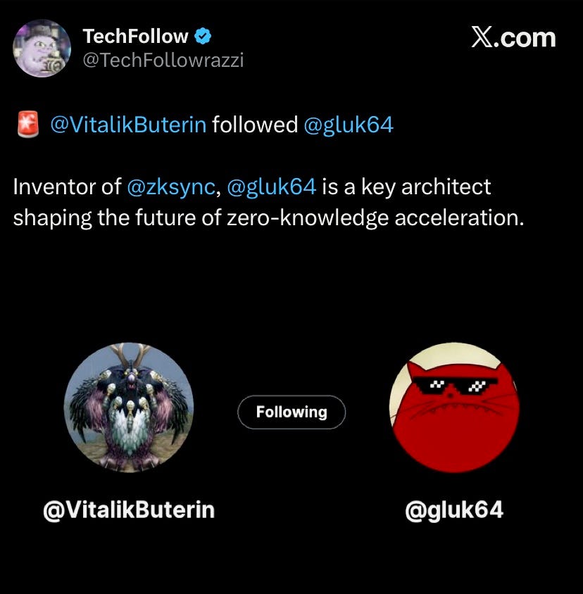 Vitalik recently followed zkSync founder Alex Gluchowski, shortly after zkSync announced its new Interop solution. The protocol allows any ZK stack chain to access Ethereum L1 DeFi liquidity natively, avoiding fragmentation and slow bridges. For example, users can lend assets on Aave from an L2 while still interacting with L1 markets.
