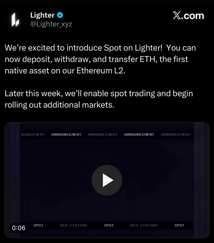 Lighter introduced Spot trading debuting with ETH transfer and plans to expand into other markets