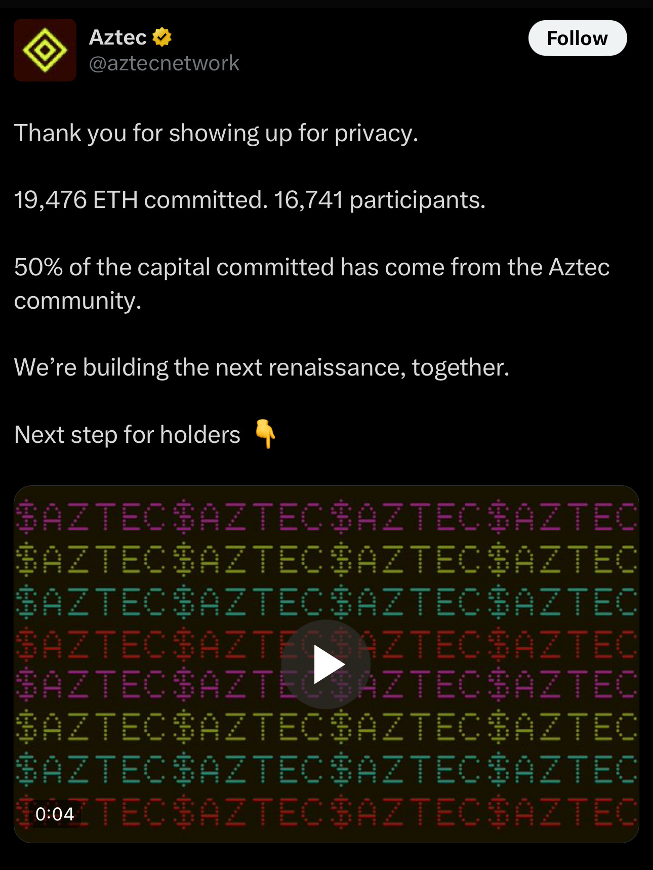 Aztec raised 19,476 ETH from their token sale using Uniswap’s Continuous Clearing Auction mechanism