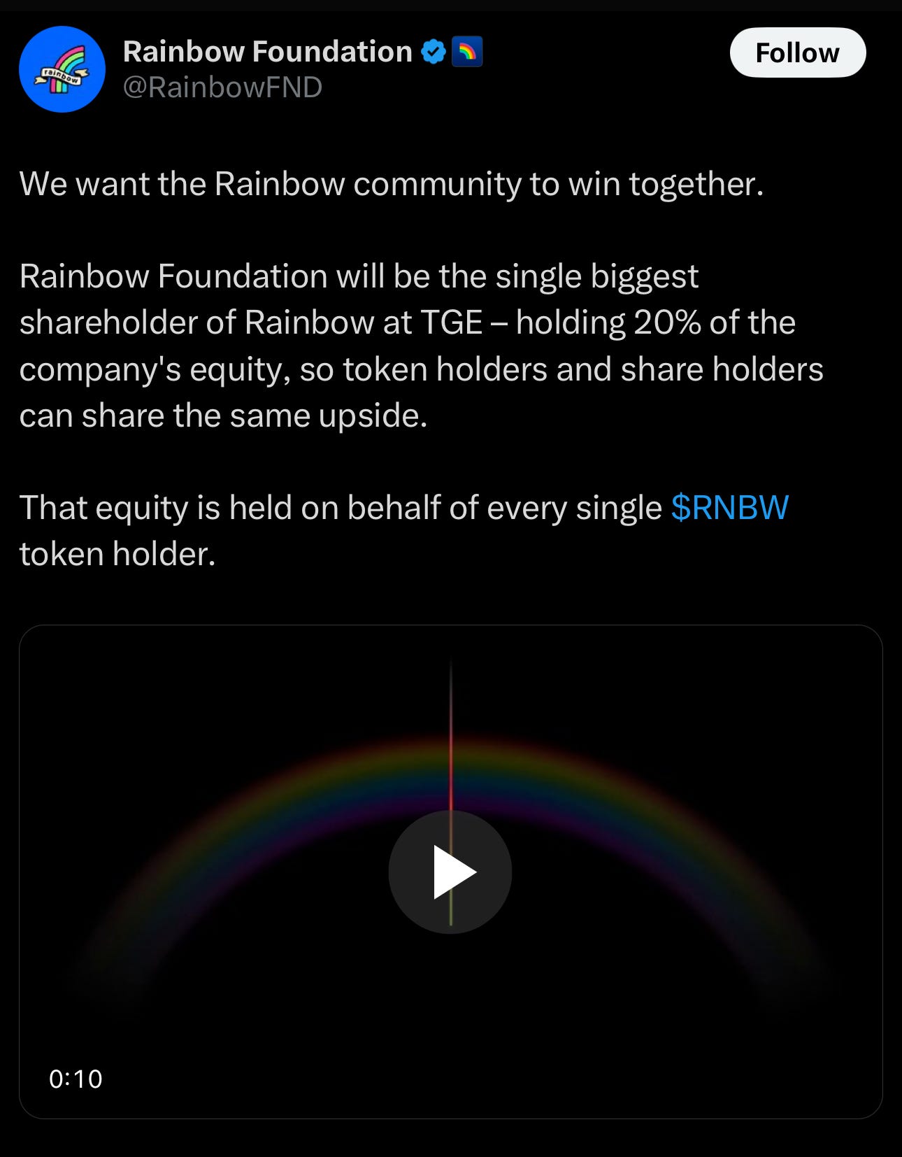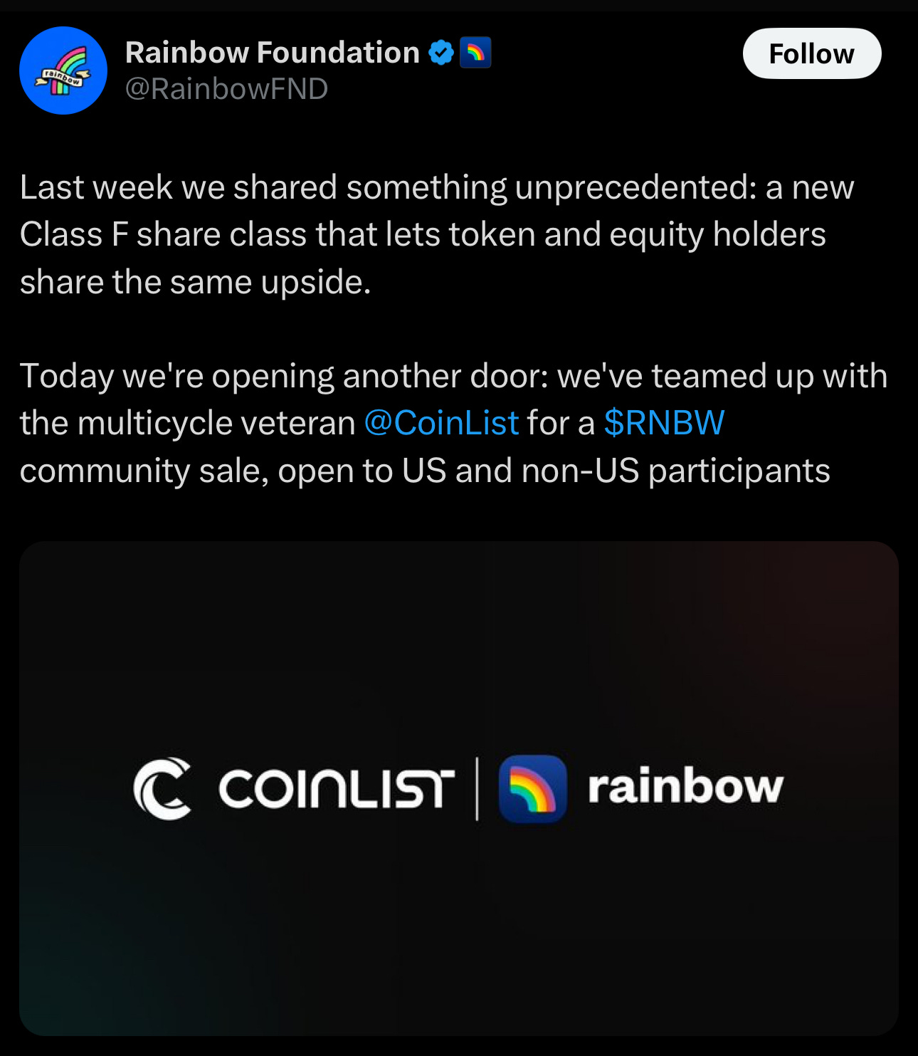Rainbow’s RNBW token public sale will launch on December 11th at 5pm UTC on CoinList for US and non-US users, following announcement of 20% equity stake for token holders via Class F shares.