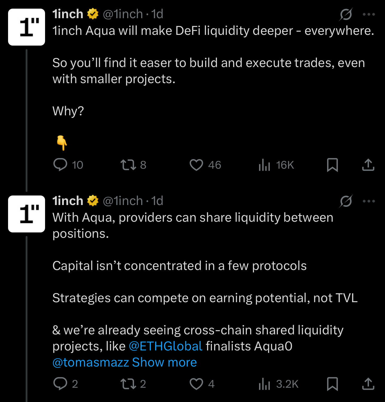 1inch launched Aqua Protocol, a shared liquidity layer enabling assets to power multiple DeFi strategies simultaneously from one wallet via atomic transactions, with full UI coming early 2026.