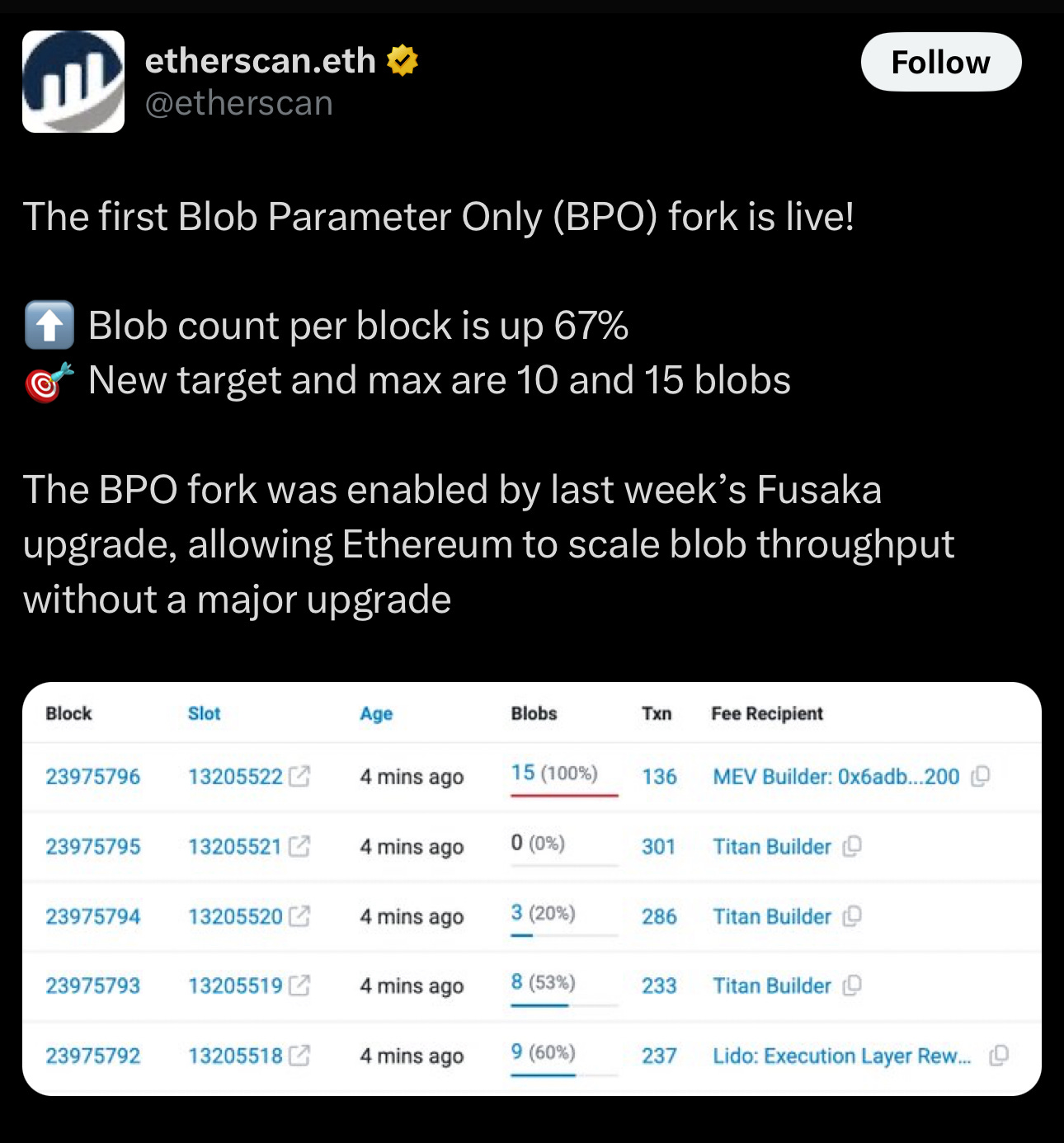 Ethereum’s Blob Parameter Only fork introducing EIP-7892 went live yesterday, increasing blob target from 6 to 10 and max limit from 9 to 15 to reduce L2 costs, with next upgrade scheduled January 7th raising limits to 14 and 21.