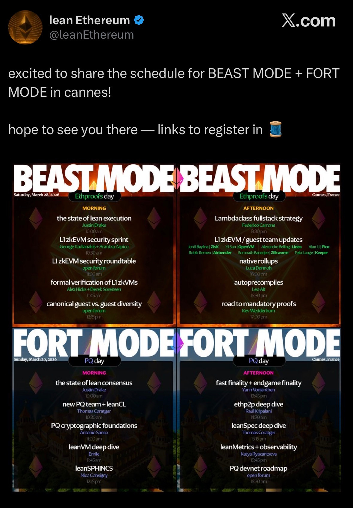 Lean Ethereum shared the schedule for Beast Mode and Fort Mode events in Cannes.