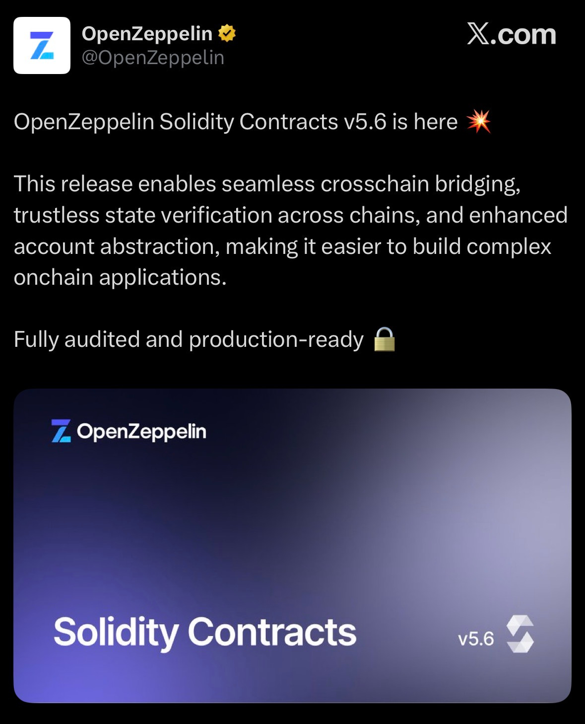 Open Zeppelin announced Solidity Contracts v5.6, enabling cross-chain bridging, trustless state verification, and enhanced account abstraction for complex on-chain applications.