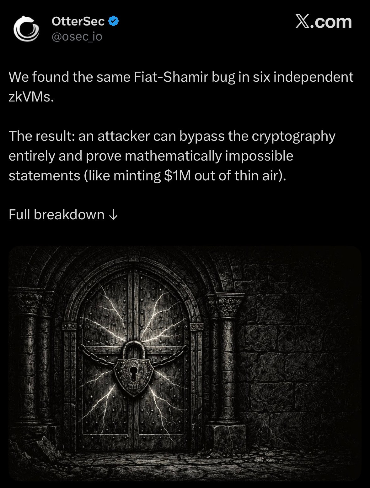 Otter Sec reported that a shared Fiat-Shamir vulnerability across six independent zkVMs lets attackers bypass cryptography and generate mathematically impossible proofs, such as minting $1 million out of thin air.