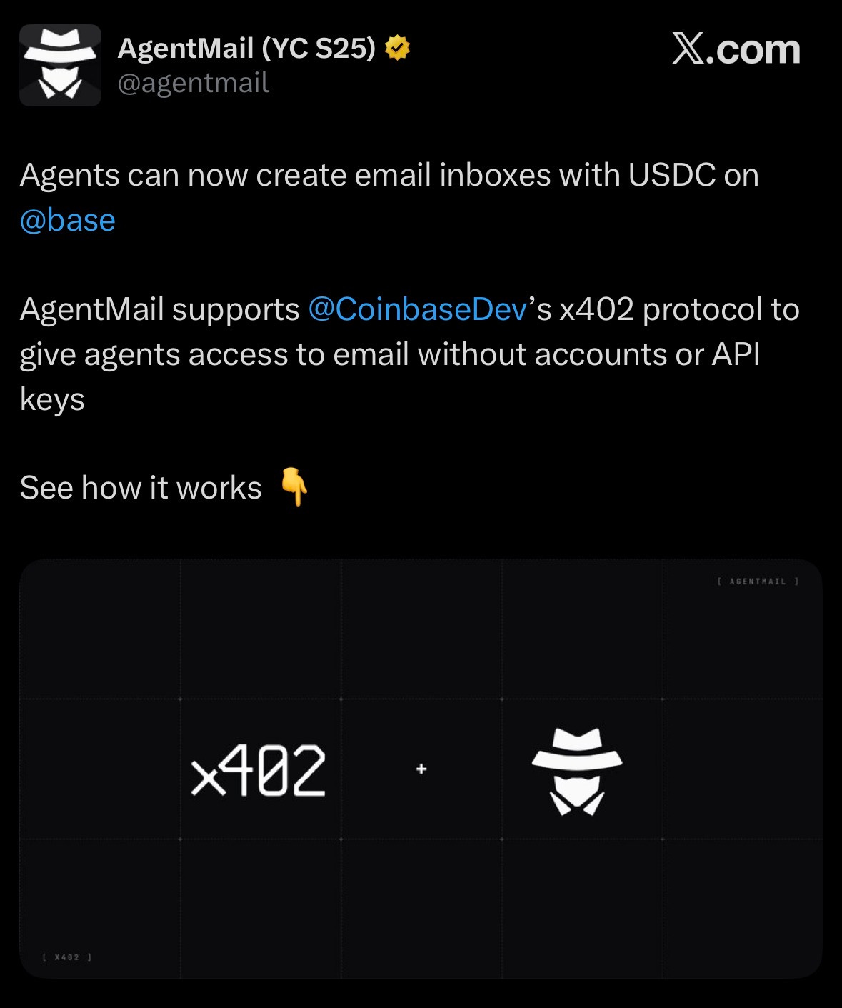 Agent Mail now lets agents set up email inboxes using USDC on base via x402 protocol