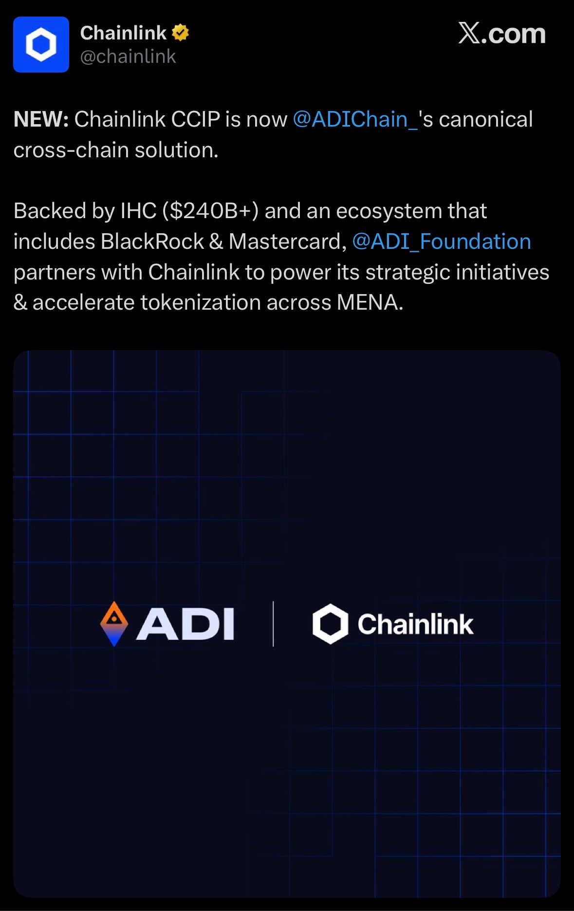The ADI Foundation and Chainlink announced a partnership to accelerate stablecoin adoption and tokenization initiatives across the Middle East, Africa, and Asia
