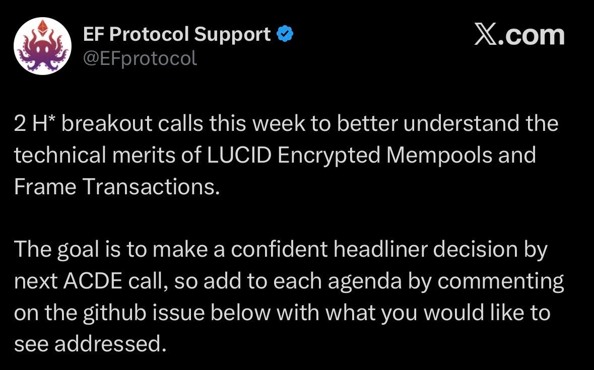Ethereum foundation Protocol Support announced two Hegota breakout calls this week to review LUCID Encrypted Mempools and Frame Transactions.