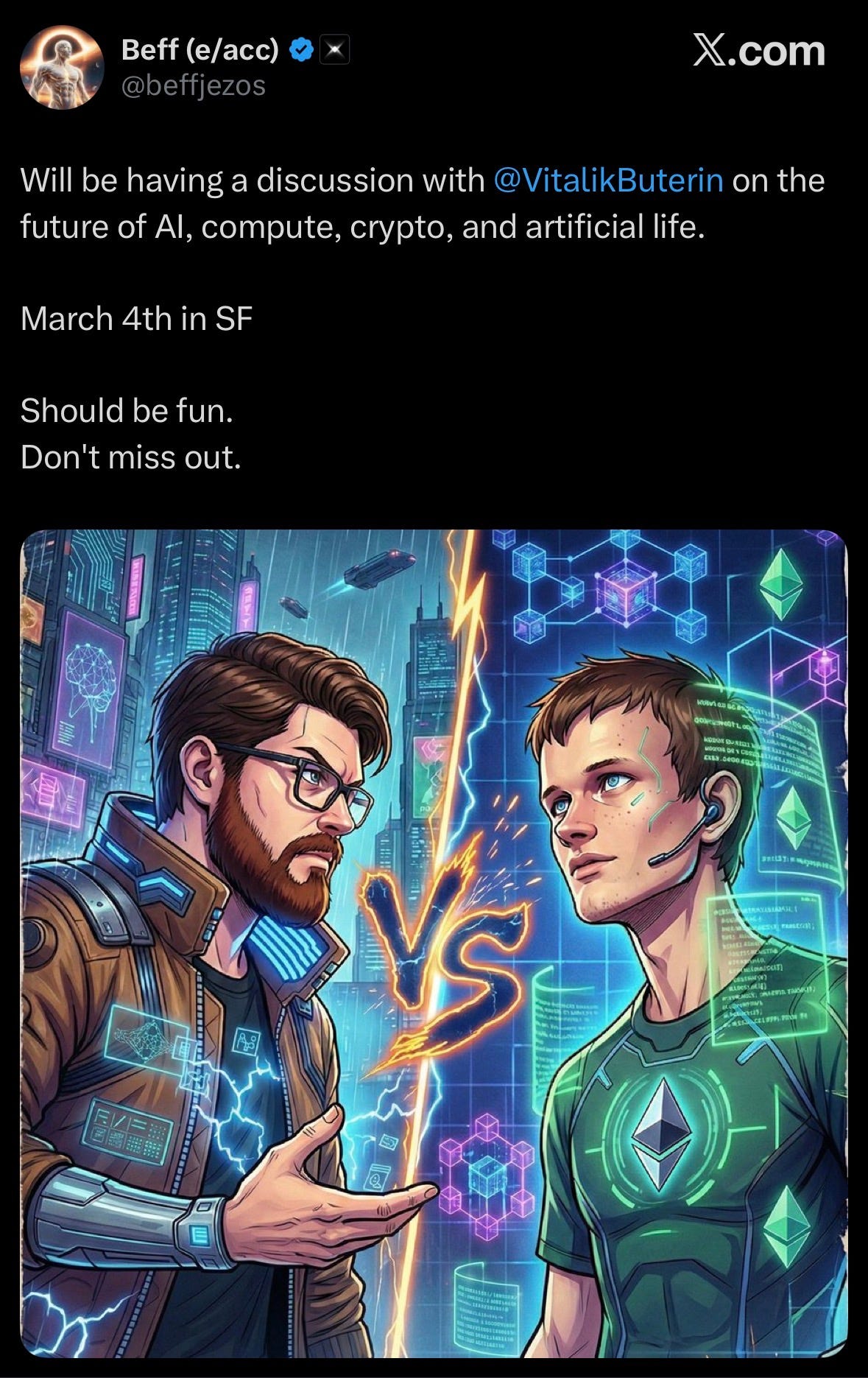 Beffjezos will have a talk with Vitalik on March 4 in San Francisco, covering the future of AI, compute, crypto, and artificial life.