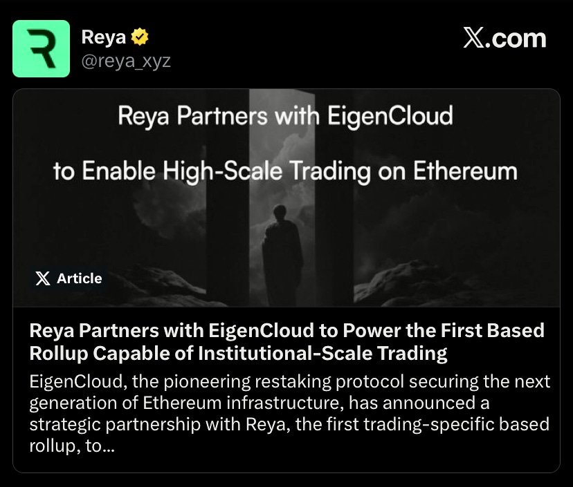 Reya partnered with EigenCloud to integrate EigenDA for its zk based trading rollup targeting 1ms execution and 200K TPS, using Ethereum validators for sequencing, zk prover network for order verification, and multi-sequencer architecture for dex.