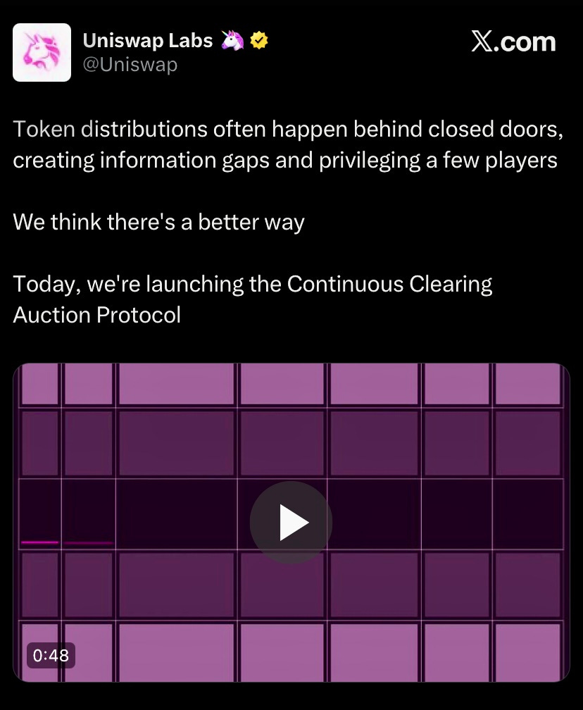 Uniswap launched Continuous Clearing Auction (CCA) protocol on v4 for permissionless, customizable token auctions with automatic liquidity bootstrapping, optional ZK Passport privacy, and block-by-block continuous clearing price discovery.