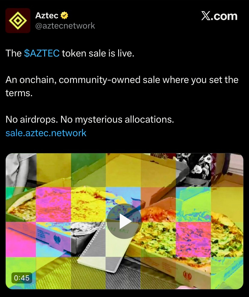 Privacy L2, Aztec Network announced AZTEC token sale registration using Uniswap’s CCA mechanism at $350M FDV floor with 14.95% supply available, tokens locked minimum 90 days with governance-controlled unlock and 12-month backstop, public sale starts on December 2.