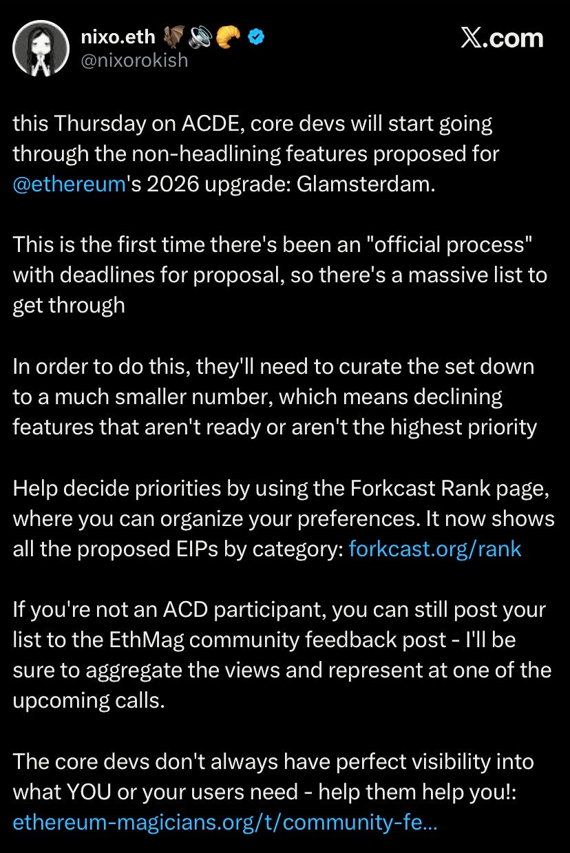 Ethereum core devs to begin reviewing features and EIPs for the 2026 ETH Glamsterdam upgrade this Thursday on ACDE #224