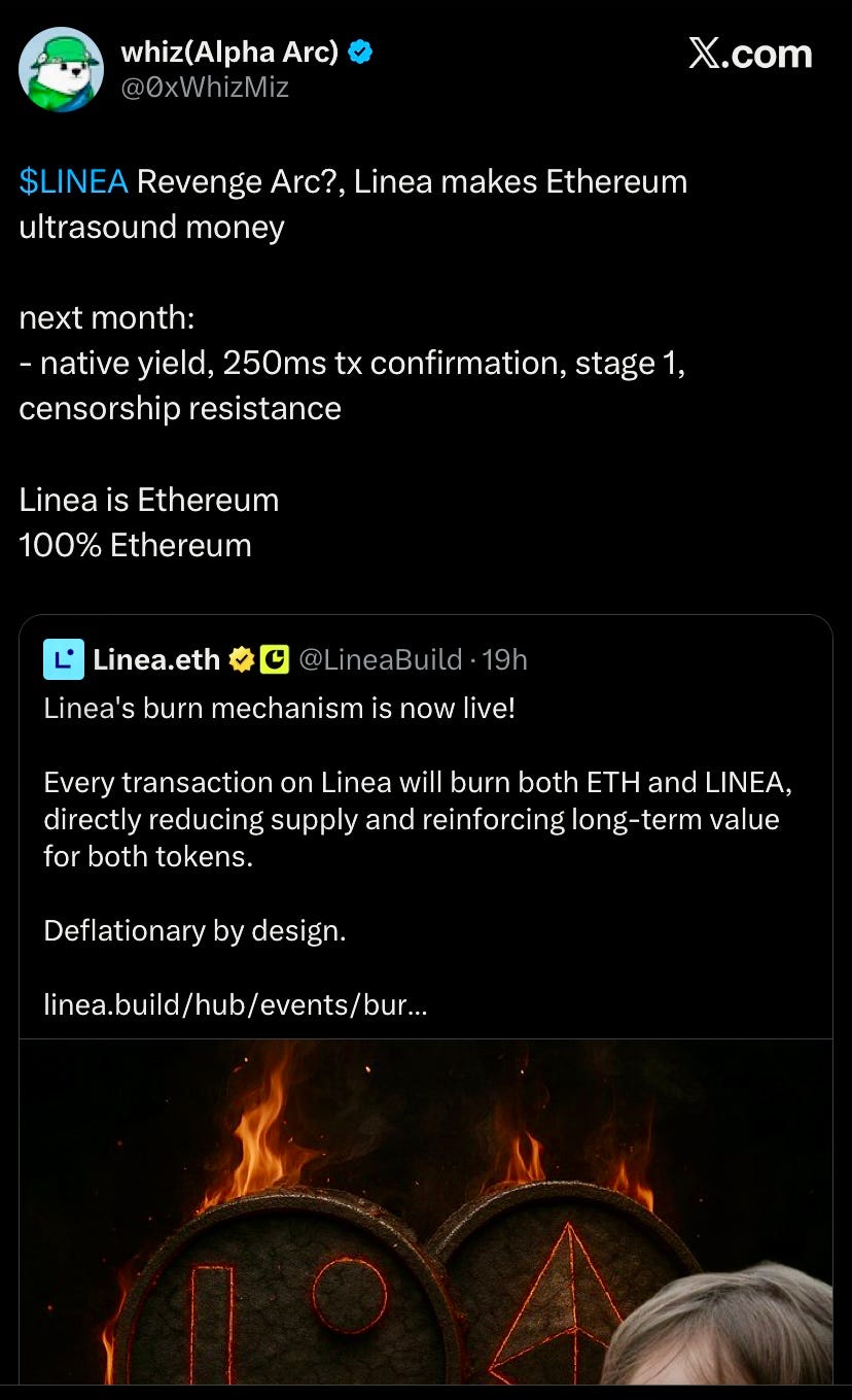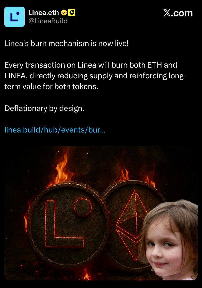 Linea activated its burn mechanism, becoming the first L2 to burn both ETH and LINEA on every transaction while paying Ethereum settlement fees. The first burn totaled ~$287k, split 20% ETH and 80% LINEA.