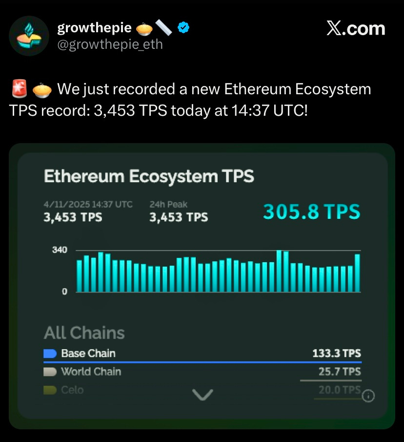 Ethereum recorded a new scaling record at 3,453 TPS yesterday at 14:37 UTC