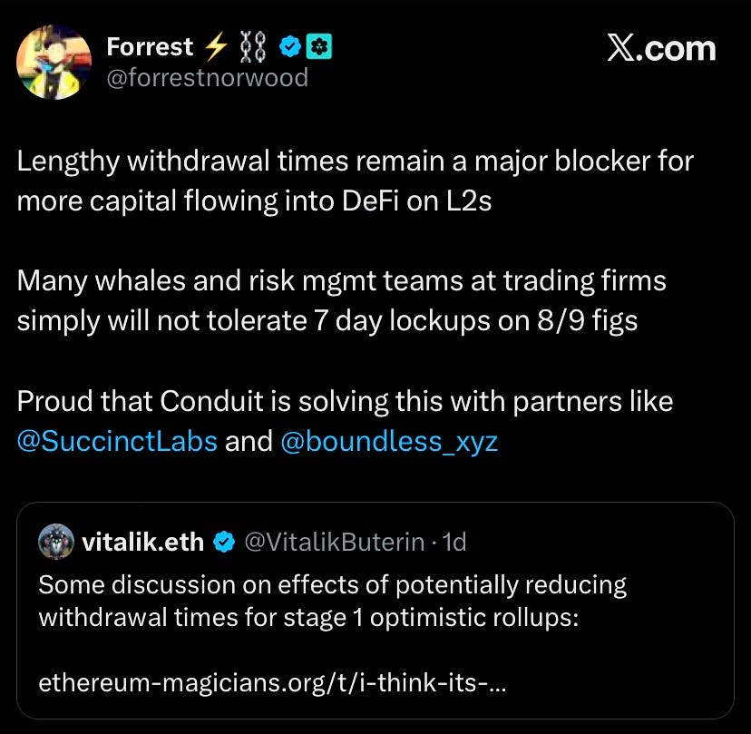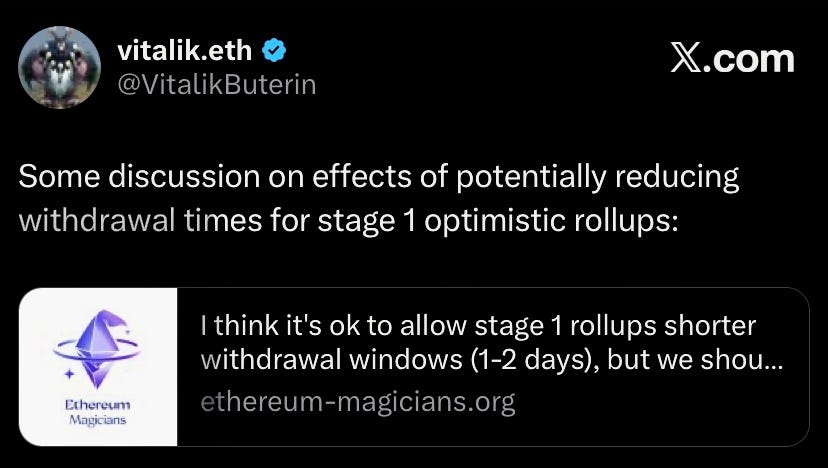Vitalik proposed reducing withdrawal time to 1-2 days for stage-1 optimistic rollups while maintaining 7 days for stage-2 rollups