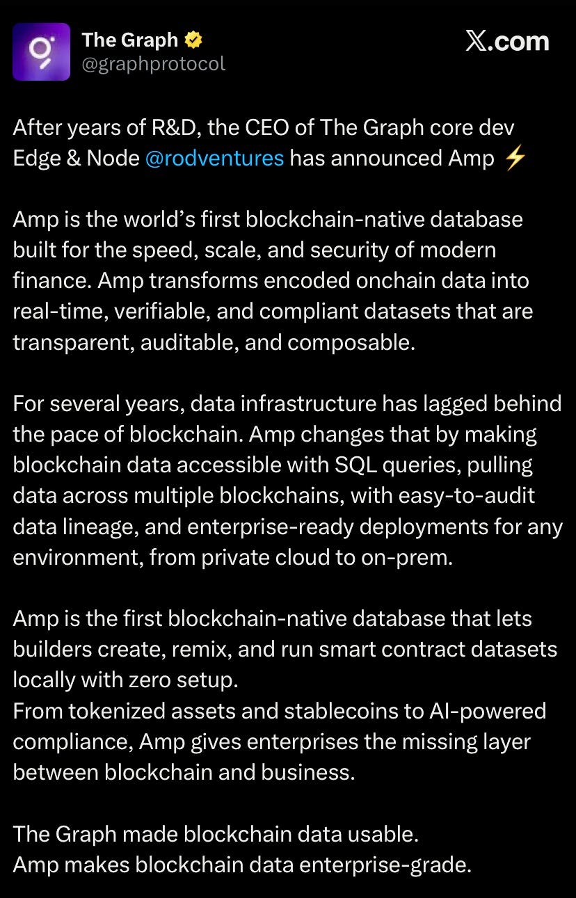 Graph protocol unveiled new product Amp, a blockchain-native database enabling real-time, verifiable, cross-chain SQL queries with enterprise-grade security and zero-setup local development, to make on-chain data compliant