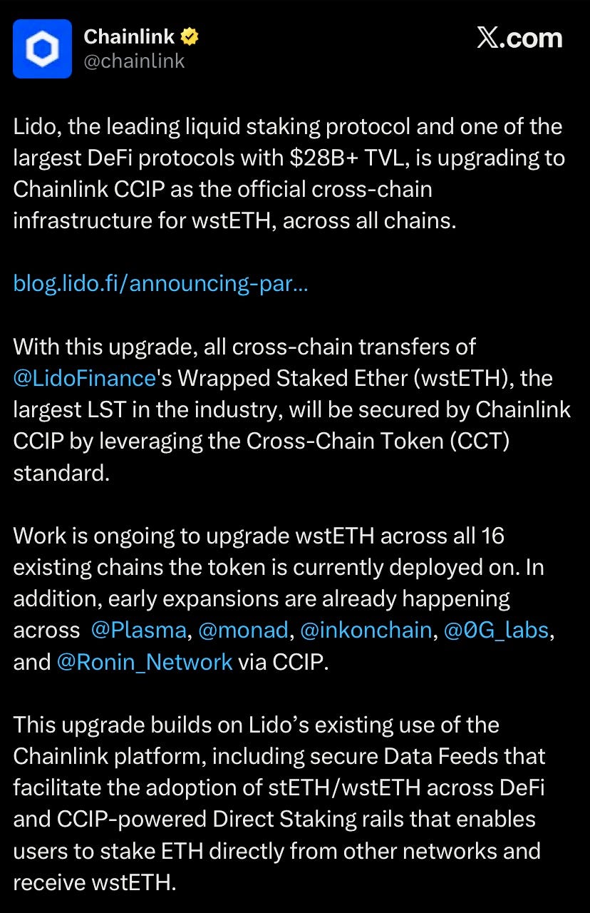 Lido upgraded to Chainlink CCIP as the official cross-chain infra for wstETH