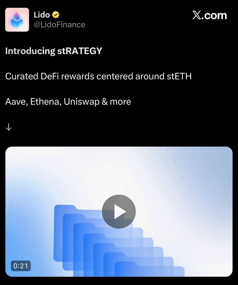 Lido introduced stRATEGY, a new curated DeFi vault built on Mellow Protocol’s Core Vaults infrastructure centered on stETH Defi strategy featuring integrations with Aave, Ethena, Uniswap. Users can deposit ETH, WETH or wstETH to receive strETH