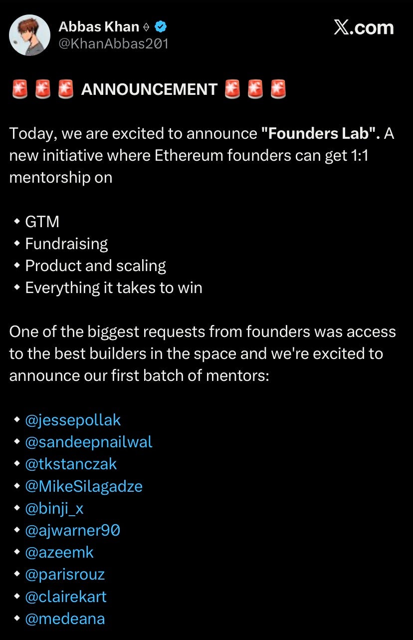 Ethereum Foundation launched Founders Lab, a two day 1:1 mentorship program at Devcon (Nov 18–19) for early stage Ethereum founders, featuring top builders like Jesse Pollak and Sandeep Nailwal, with limited spots via application.