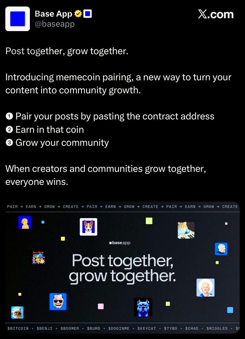 Creators on Base can now pair a meme coin directly to their profile, so every like you get rewarded with your token