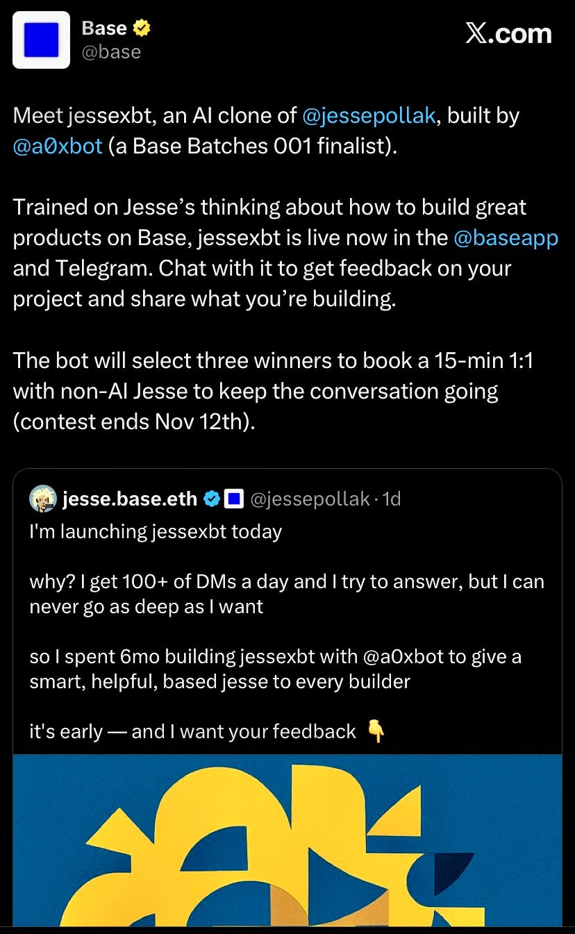 Jesse Pollak unveiled Jessexbt, an AI clone of Jesse’s thinking live on Telegram and Base App to help Base devs improve their product through conversions with it built by a0xbot