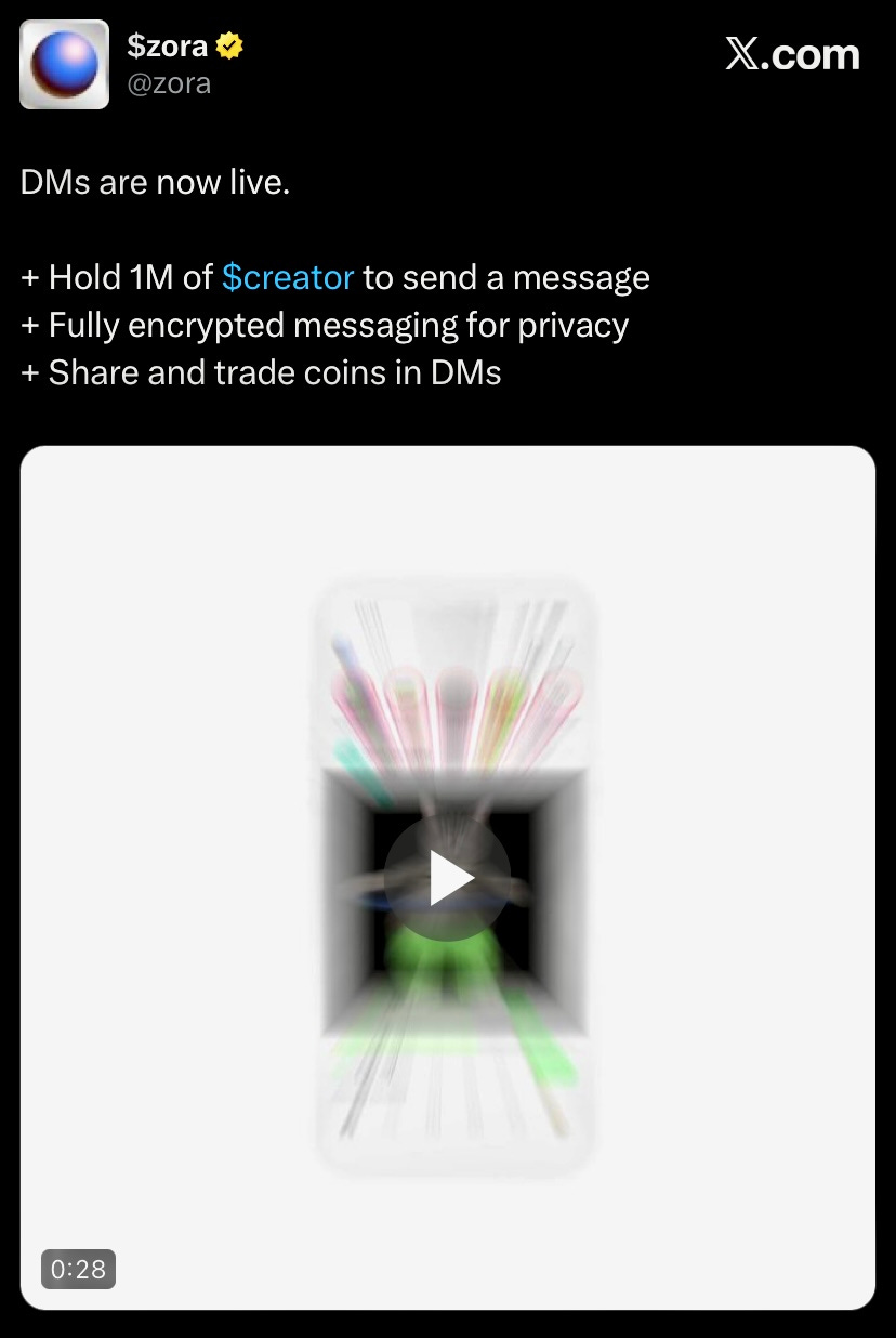 Zora announced token-gated, fully encrypted DMs powered by XMTP, requiring 1M of a creator’s coin to message them, with in chat trading and privacy