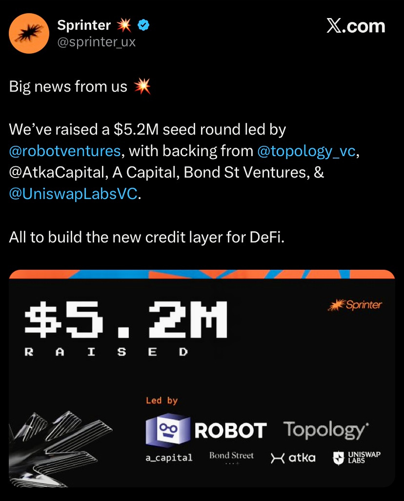 Sprinter raised $5.2 million seed round led by Robot Ventures to develop cross-chain solving-as-a-service infrastructure, offering solvers and market makers collateral-free credit