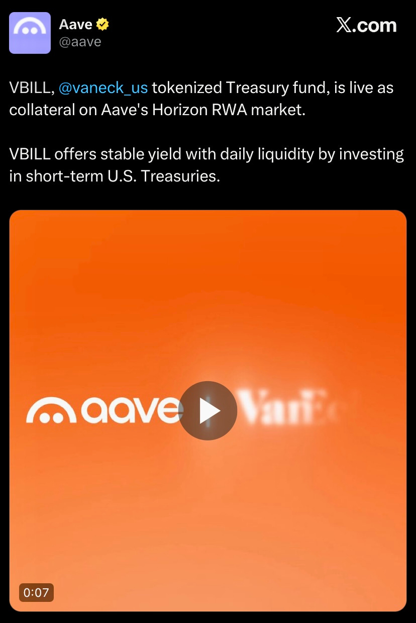 VBILL by VanEck went live as collateral on Aave Horizon RWA markets secured by Chainlink’s NAVLink framework