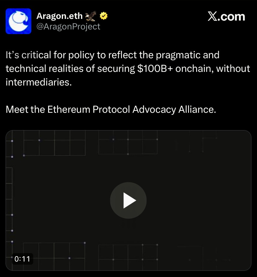Aragon announced the launch of the Ethereum Protocol Advocacy Alliance (EPAA), a collaborative initiative uniting Aave, Curve, Lido, Spark, Graph, Uniswap to educate policymakers on blockchain technology and protect decentralization, transparency, and permissionless access as regulators increasingly scrutinize the $140B+ DeFi ecosystem.