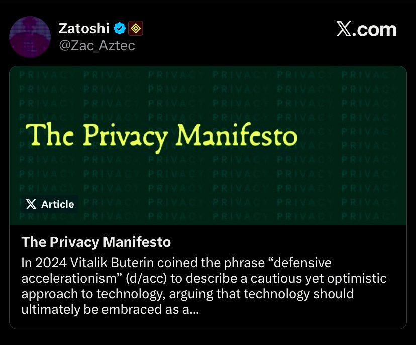 Aztec founder Zachary Williamson argued that while Vitalik Buterin’s “defensive accelerationism” (a cautiously optimistic approach to technology development) offers good principles, the attention economy has corrupted technology into a surveillance apparatus that commodifies human data and destroys social cohesion and only zk cryptography combined with privacy-preserving blockchains can create alternative business models (like micropayments replacing ad driven monetization) that restore human dignity, self sovereignty, and meaningful choice in the digital age.