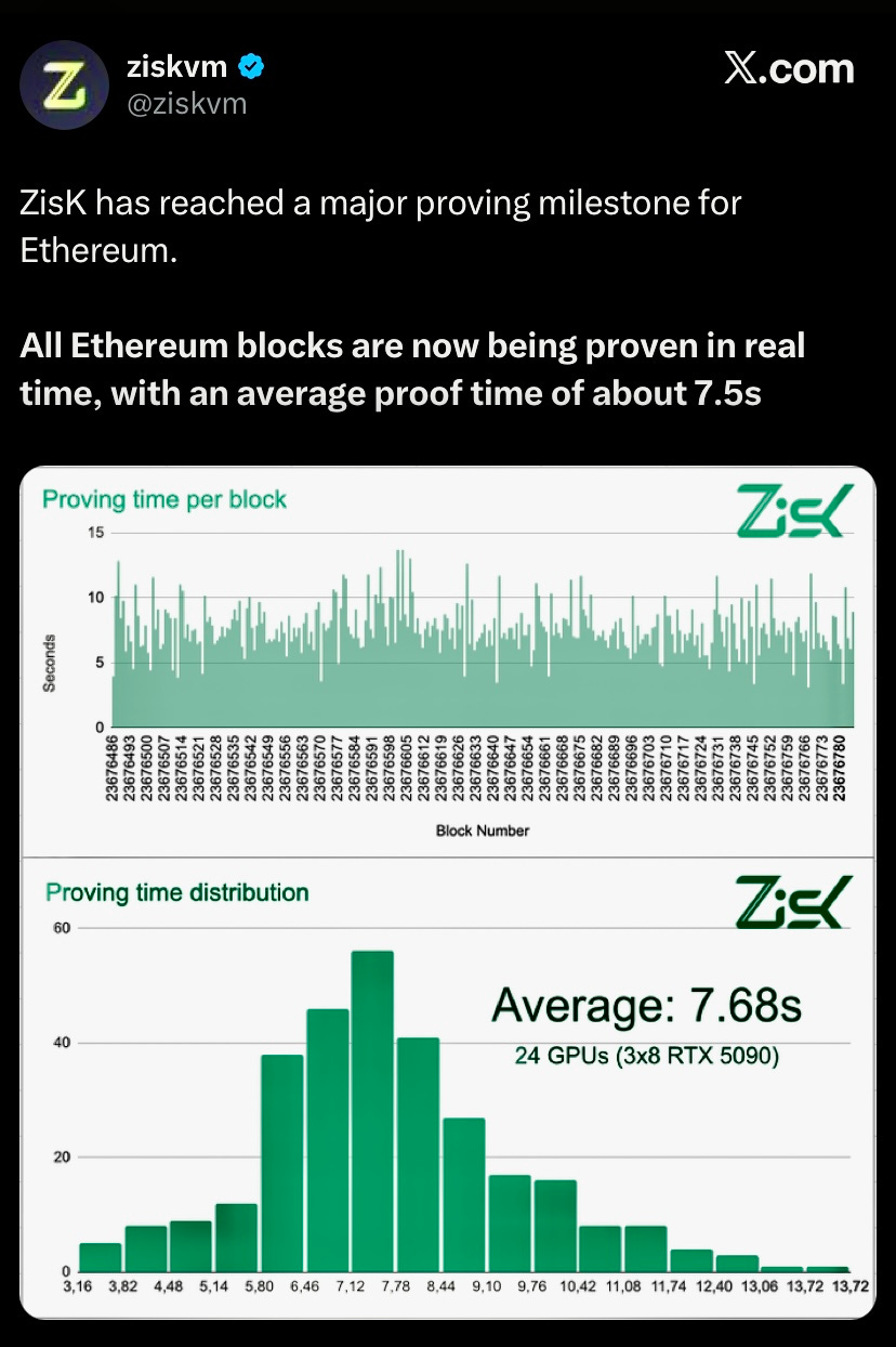 ZisK, a zero-knowledge virtual machine led by Jordi Baylina, achieved real-time Ethereum block proving with version 0.13. The system generates zk-proofs in roughly 7.5 seconds using 24 NVIDIA RTX 5090 GPUs working cooperatively