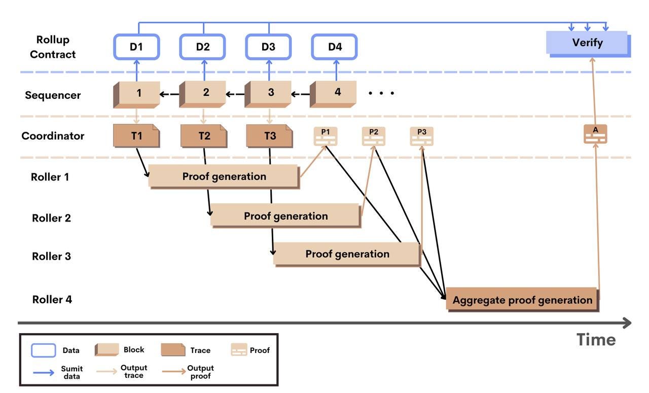 Next, the Coordinator randomly selects a Roller to generate a validity proof for each block trace. The Roller then sends the block proof back to the Coordinator, and for every k blocks, an aggregation task is dispatched to another Roller to combine k block proofs (k here signifies the number of blocks) into a single aggregate proof.