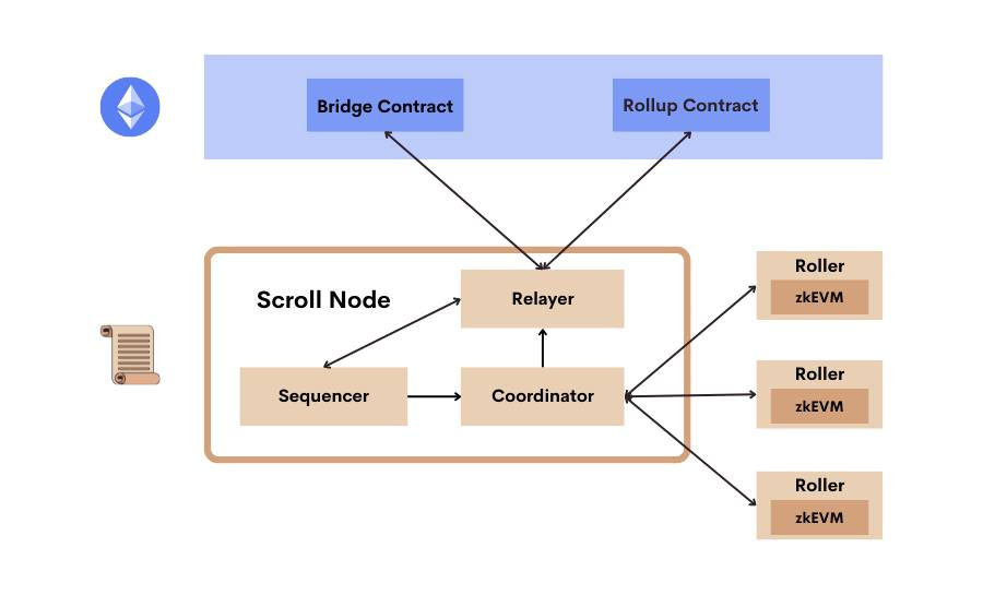 The Scroll Node comprises three parts: the Sequencer, Coordinator, and Relayer.