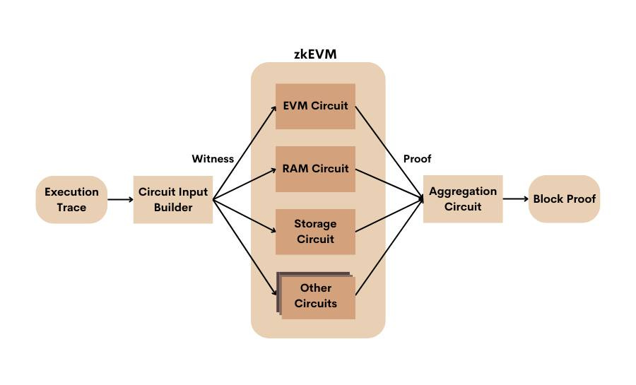 3. Uses proof aggregation to to combine multiple zkEVM circuits to a single proof. Note: a zk circuit is made arithmetically