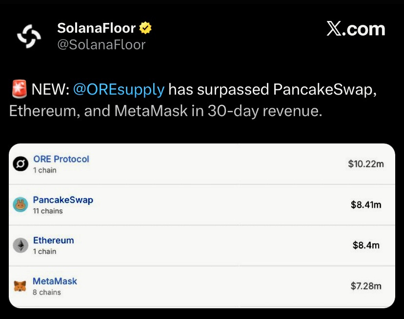 Solana POW Token OREsupply surpassed Pancakeswap, Ethereum and MetaMask in 30 day revenue at $10.22M