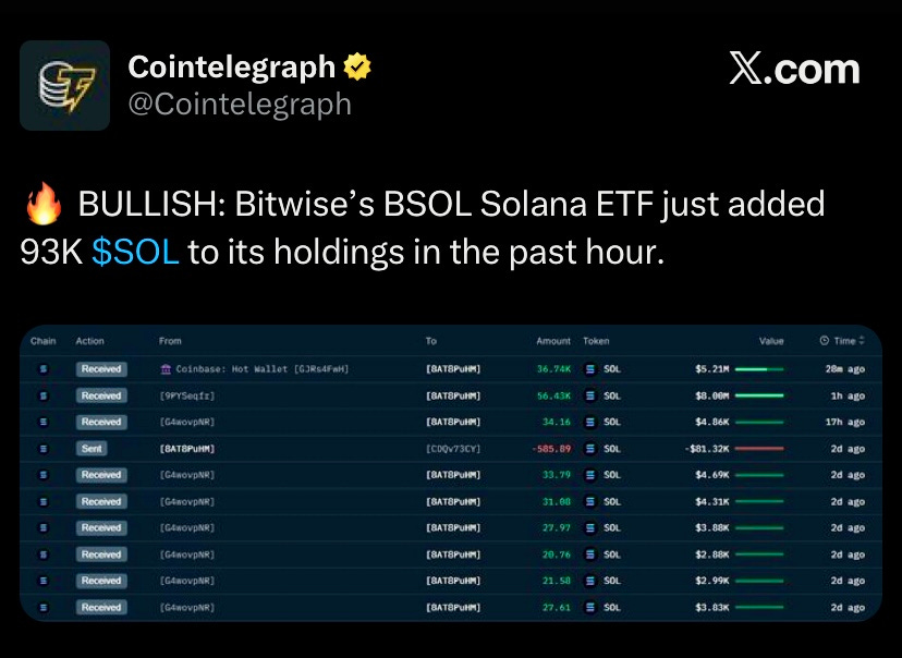 Bitwise’s BSOL dominated Solana ETF inflows with $86.3M over the past week, more than all other Solana ETFs combined, as total weekly inflows hit $108.2M and cumulative flows reached $618M.